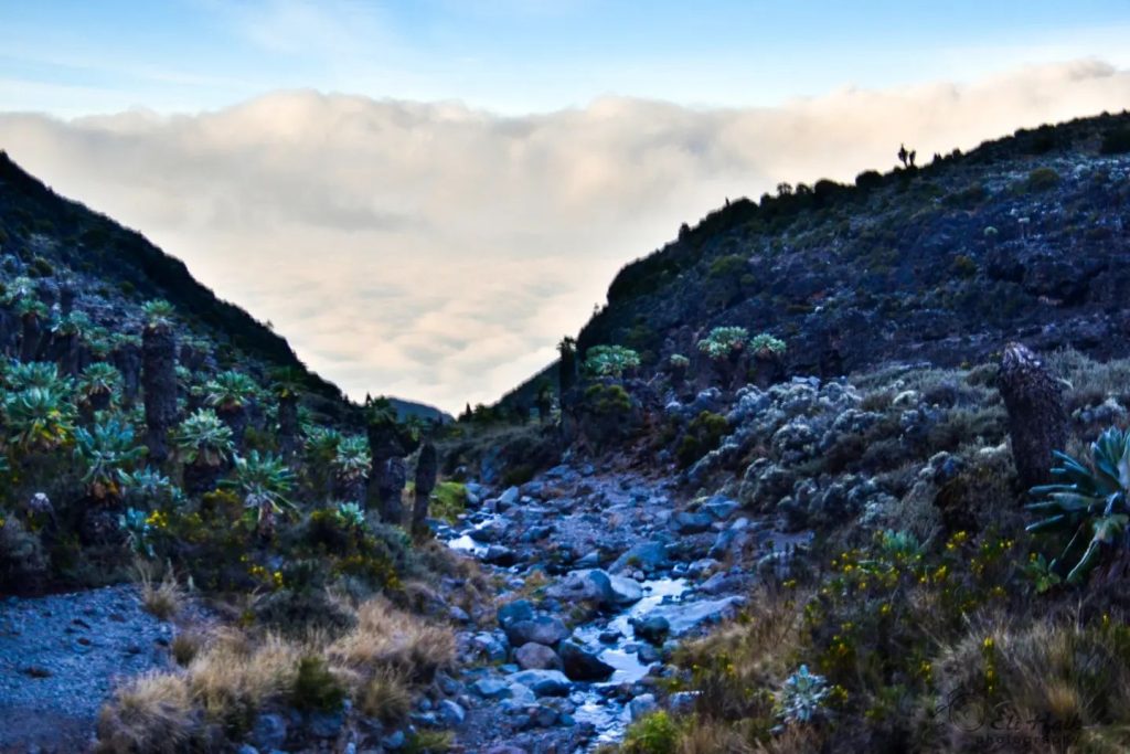 Mid-altitude: Moorland and heath zones dotted with giant lobelias and groundsels.